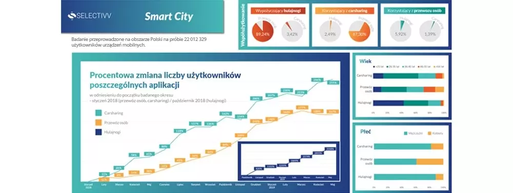 Badanie objęło osoby korzystające z aplikacji oferujących przewóz osób, wypożyczanie samochodów na minuty i hulajnóg elektrycznych. W każdej z omawianych kategorii zbadano użytkowników trzech popularnych aplikacji używanych w Polsce. Do analizy zostali włączeni użytkownicy korzystający aktywnie z aplikacji w okresie od stycznia 2018 do maja 2019 r., w tym dla hulajnóg elektrycznych od października 2018 r. Określona została demografia użytkowników i współużytkowanie pomiędzy kategoriami aplikacji. Łącznie przeanalizowano ponad 22 mln użytkowników.